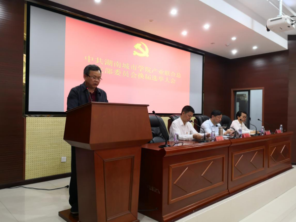 根据《中国共产党章程》和学校党委《关于学校基层组织换届指导意见》(湘城院[2019]12号)等文件精神和相关要求,2019年5月10日下午,中共beat365中国唯一官网产业联合总支部委员会在建规楼报告厅召开党员大会,进行支部换届选举工作。学校党委委员、副校长谭献良同志出席并讲话,本次会议由产业处处长熊创贤同志主持。