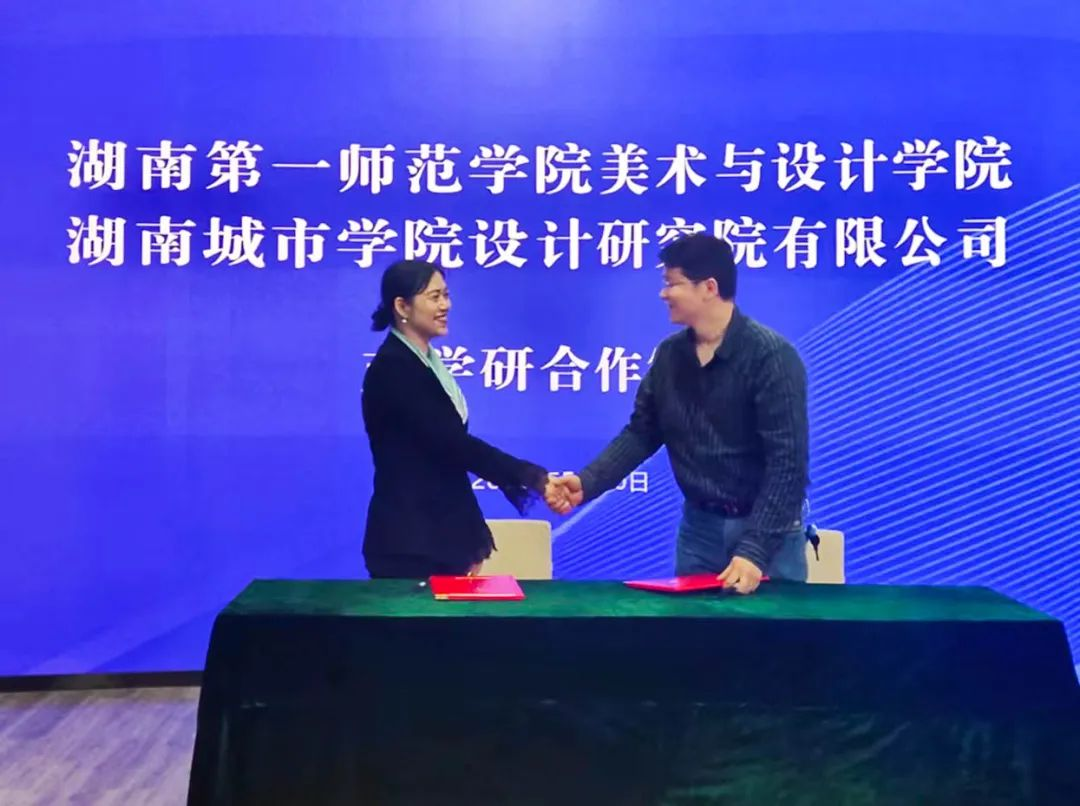 仪式上,湖南第一师范学院美术与设计学院与beat365中国唯一官网设计研究院有限公司签署了产学研合作协议,并聘任设计院院长李志学为“创新设计产学研究中心企业名师”。双方将通过深化校企合作,进一步深度拓展产学研融合,共享共赢。