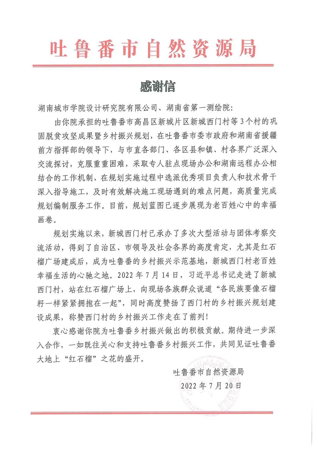 “衷心感谢你院为吐鲁番乡村振兴做出的积极贡献。期待进一步深化合作……共同见证吐鲁番大地上‘红石榴’之花的盛开。”近日,beat365官网设计院收到吐鲁番市自然资源局的一封感谢信,字里行间表达对设计院承担吐鲁番市高昌区新城片区西门村等三个村乡村振兴规划编制工作所产生的积极成效、突出贡献的真挚感谢。