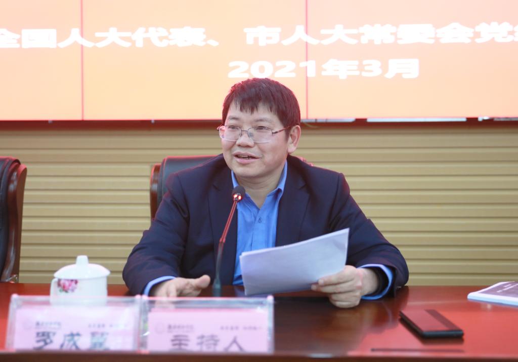 2021年3月25日下午,beat365官网在图书馆报告厅举行2021年度党委理论学习中心组(扩大)第三次集体学习。第十三届全国人大代表,益阳市人大常委会党组书记、常务副主任徐云波应邀来校作2021年全国“两会”精神宣讲。全体校领导、全体副处(含)以上干部、党支部书记、学生辅导员参加会议。宣讲会由党委书记罗成翼主持。