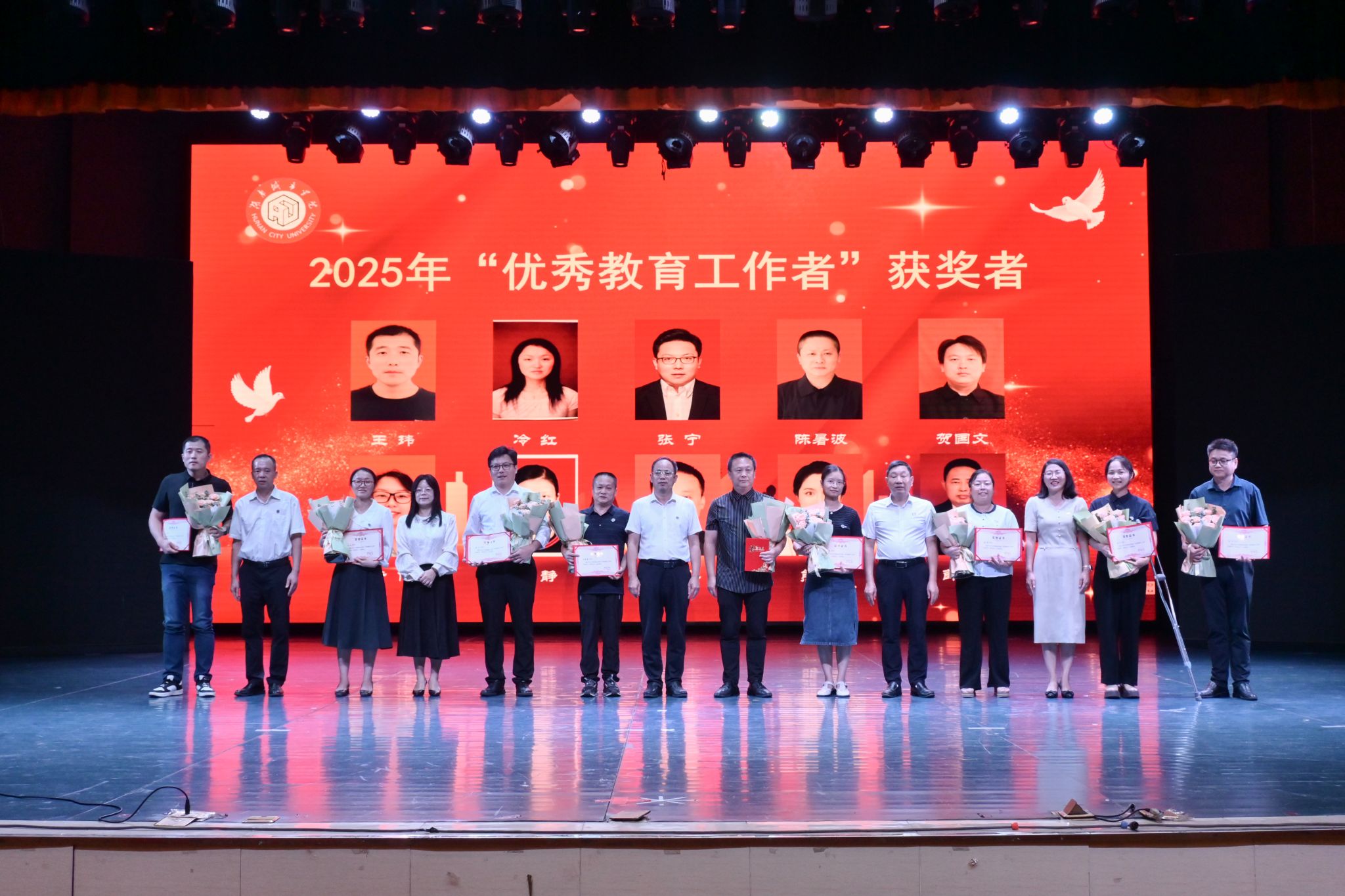 何振代表学校党委行政向为学校事业发展倾注智慧和心血的全体教职员工、离退休老同志致以节日的问候和衷心的感谢,并向受表彰的先进个人表示热烈的祝贺和崇高的敬意。他全面回顾了过去一年学校在教师队伍建设、教学科研、学科专业发展、条件保障等方面的显著成效。他指出,一年来,全校教师以习近平总书记关于中国特有的教育家精神的重要论述为指引,以赤诚之心、奉献之心、仁爱之心投身教育事业,主动服务湖南省“三高四新”美好蓝图,奋力谱写了教育强省、人才兴校的生动实践。