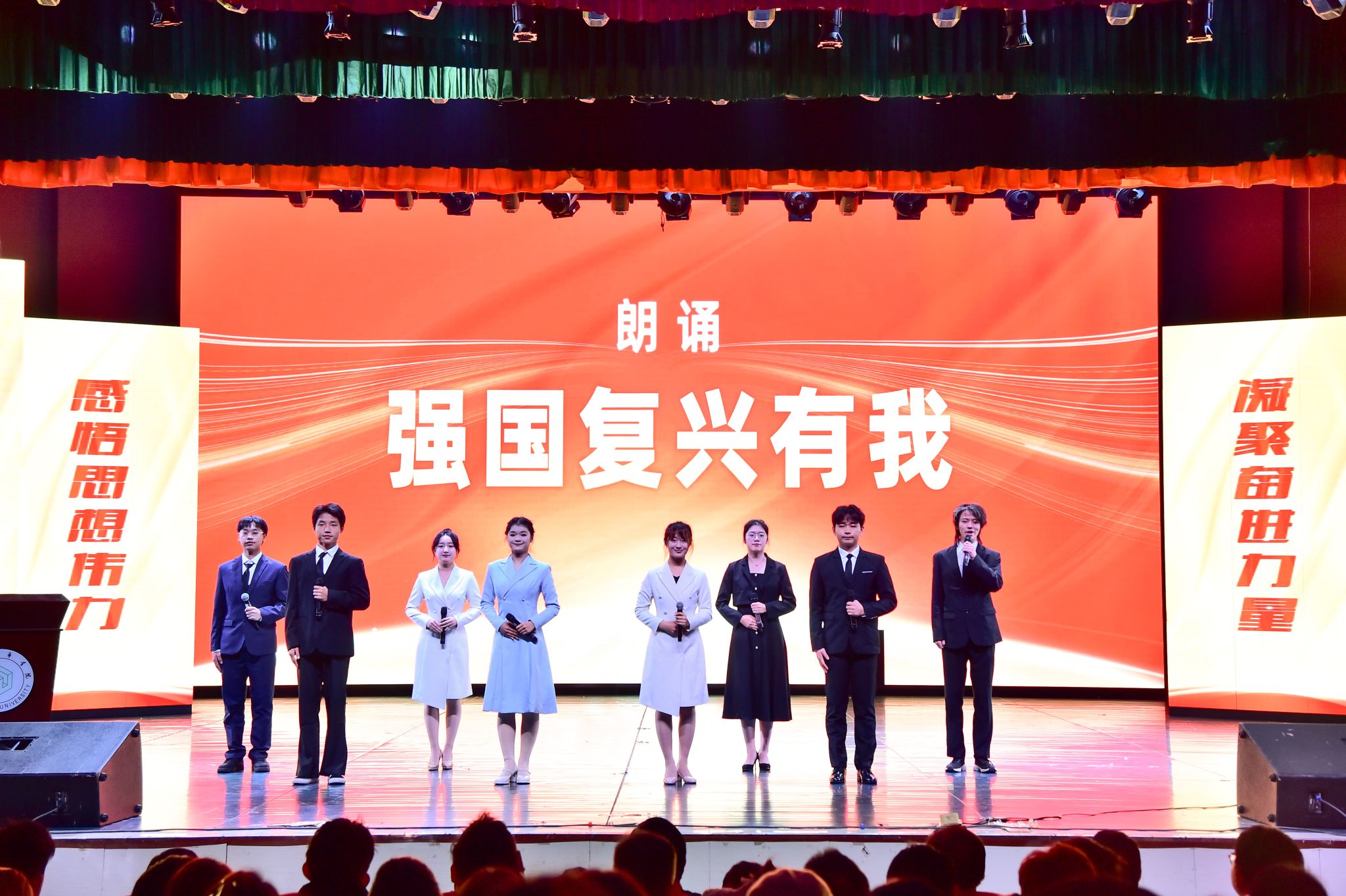 “奋斗正青春!请党放心,强国复兴有我!”城院学子铿锵有力的朗诵《强国复兴有我》将思政课推向高潮。在热烈的氛围中,全场师生深情合唱《歌唱祖国》,本次思政课圆满落下帷幕。