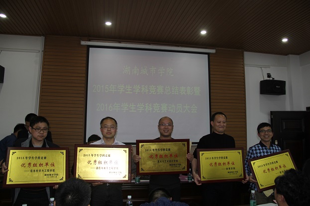 教务处副处长袁华斌宣读了2015年学科竞赛表彰决定。孟昭武及教务处、团委负责人给相关获奖人员颁奖。