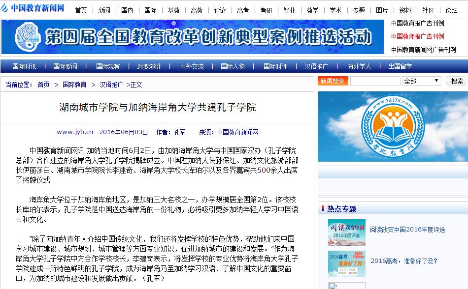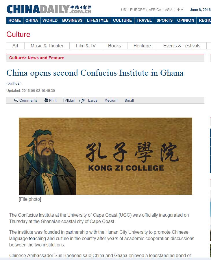 国务院新闻办公室网站、外交部网站、国家汉办网站、新华非洲网、中国侨网、中国日报、中国新闻网、中国教育新闻网、中国高校之窗、中国建设报、湖南省教育厅网站、湖南卫视、三湘都市报、湖南教育新闻网、益阳电视台、益阳日报、加纳华人论坛等二十余家网站和媒体进行专题报道或转载。