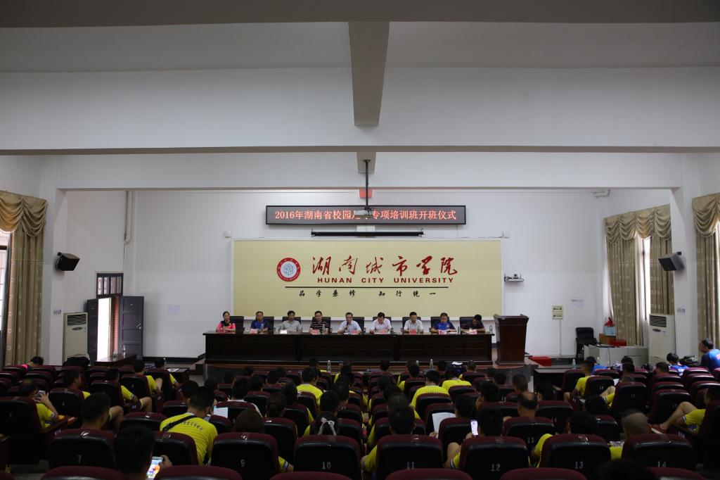 (本网讯)7月19日上午9:00,由湖南省青少年校园足球工作领导小组、省教育厅主办,beat365官网承办的2016年省青少年校园足球中小学骨干体育教师培训在beat365官网体育学院开班。省教育厅体卫艺处王宇、省校园足球办公室主任李泽群、益阳市教育局体卫艺科科长张伟,学校副校长雷存喜和教务处相关负责人、体育学院领导班子成员等出席了开班仪式。仪式由体育学院党总支书记熊兴吾主持。