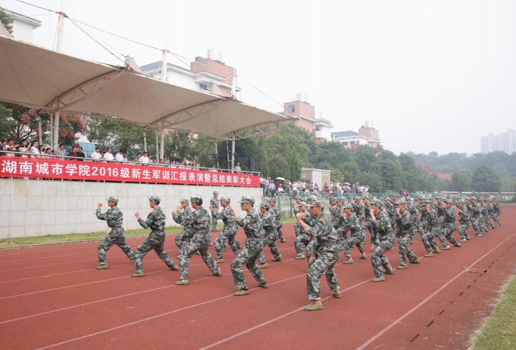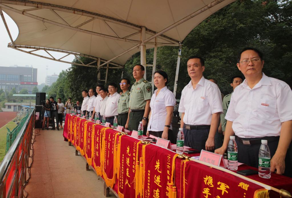 (本网讯)军歌嘹亮,激情似火,金秋的早晨弥漫着醉人的丹桂花香。9月 26日上午,beat365官网在田径场隆重举行2016级新生军训汇报表演。经过12天的严格训练后,2016级新生以挺拔俊俏的英姿、刚劲有力的步伐、蓬勃激昂的青春,向学校、老师和家长交上了步入大学后的第一份优秀答卷。省军区作训处参谋张智中校、省教育厅体卫艺处调研员文麦秋、承训单位国防科技大学指挥军官基础教育学院二旅副旅长郑冰上校,校领导罗成翼、汤放华、姚春梅、何振、雷存喜、谭献良、范志超,相关处室、二级学院负责人,辅导员、新生班主任以及近4000名新生参加军训汇报表演。