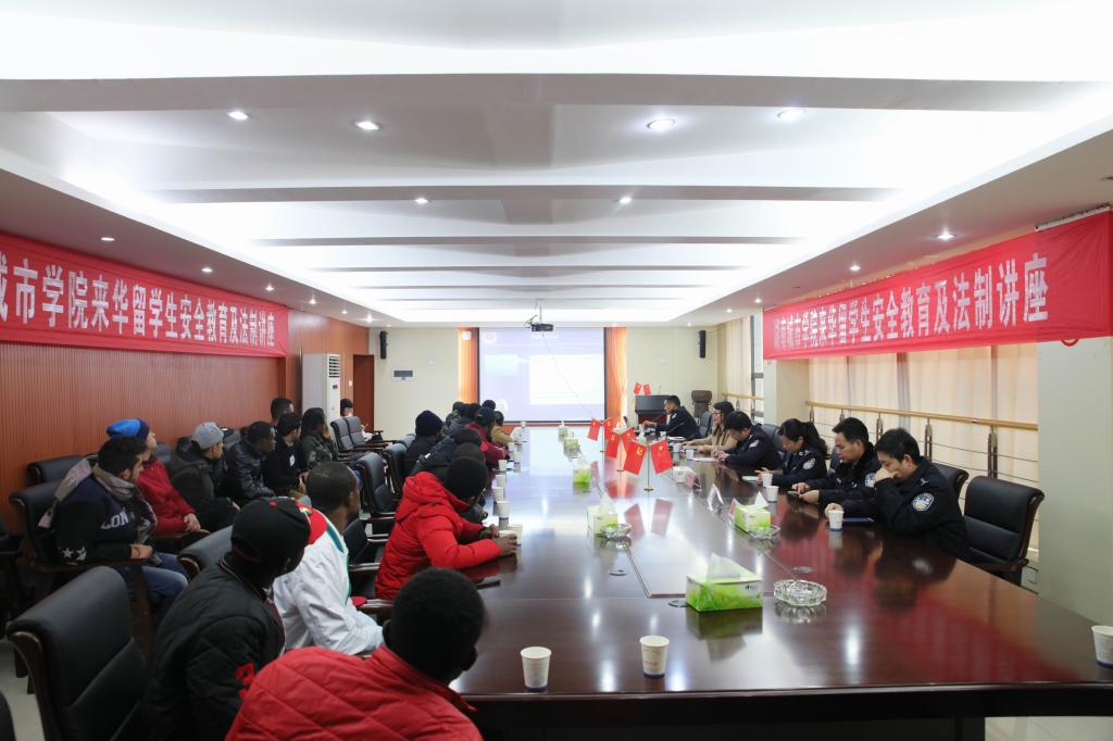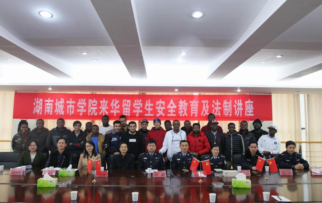 (本网讯)12月13日下午,beat365官网来华留学生安全教育与法制讲座在办公楼一会议室举行。副校长刘辉煌,益阳市公安局人口与出入境管理支队副支队长郭胜、大队长张强、外管专干彭娟、市公安局朝阳分局人口大队大队长邹亮、副大队长唐一波,beat365官网文学与新闻传播学院负责人、国际交流处全体人员以及来自加纳、也门和加拿大目前在校的22名来华留学生参加。讲座由国际交流处处长周桂平主持。