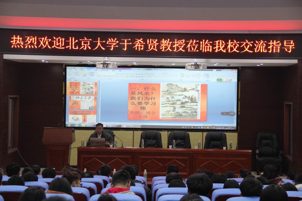 随后,于希贤着重介绍了东方科学文化体系。他认为,东方科学文化体系中提及大自然在形态上都是和谐、对称、平衡的,并以拥有严格对称结构的冰晶、用料精细形状精美的鸟巢等一系列例子作了说明。于希贤详细讲解了和谐环境与美好心境如影随形的中国梦——中国风水的人居环境艺术。他说,洞庭湖是自古以来最有名的湖泊之一,它的灵气就是水,而围湖造田则破坏了它的灵气,应将河两岸回归到最原始的自然生态区。于希贤强调中国古代的人和环境之间的梦,集中体现在《鲁班经》里,并举例说明。他指出,北京故宫祈年殿的内主柱,四根内主柱代表春夏秋冬四季,寓意了时空合一,依大自然四时运行和大顺来安排人居环境。在讲座中,于希贤多次表达了对年轻学子们的期望,希望他们在学好科学文化知识的同时,传承好我国的传统风水哲学文化。(汤慧、陈诗涵、周玥含)