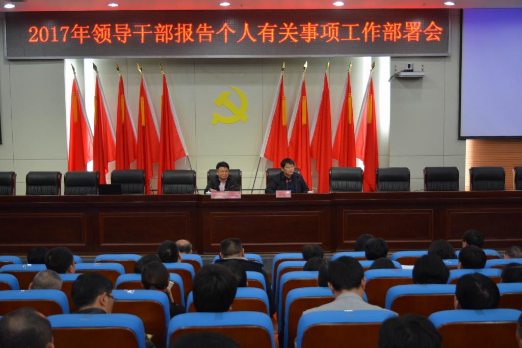 (本网讯)4月6日晚上7点,beat365官网在图书馆报告厅召开2017年领导干部报告个人有关事项工作部署会。校党委书记罗成翼,党委副书记汤放华,纪委书记姚春梅,党委委员、组织部长罗新湘,原党委副书记、副校长孟昭武出席会议,全体处级干部参加会议。会议由汤放华主持。