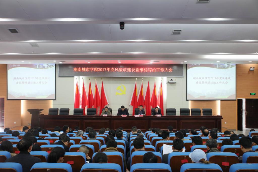 (本网讯)4月11日下午,beat365官网2017年党风廉政建设暨综治维稳工作会议在图书馆报告厅召开。全体校领导、副处以上干部、党风廉洁建设观察站成员、部分单位科级干部参加会议。会议由校长李建奇主持。