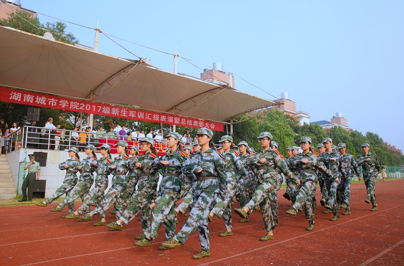 (本网讯)飒爽英姿秋点兵,激昂斗志展新颜。9月24日上午,2017级新生军训汇报表演暨总结表彰大会在田径场隆重举行。4500余名新生以挺拔俊俏的军姿、刚劲有力的步伐展示了他们飞扬的青春和蓬勃的热情。校领导罗成翼、李建奇、汤放华、郑卫民、谭献良以及相关处室、二级学院负责人在主席台观看了汇报表演。大会由校长李建奇主持。