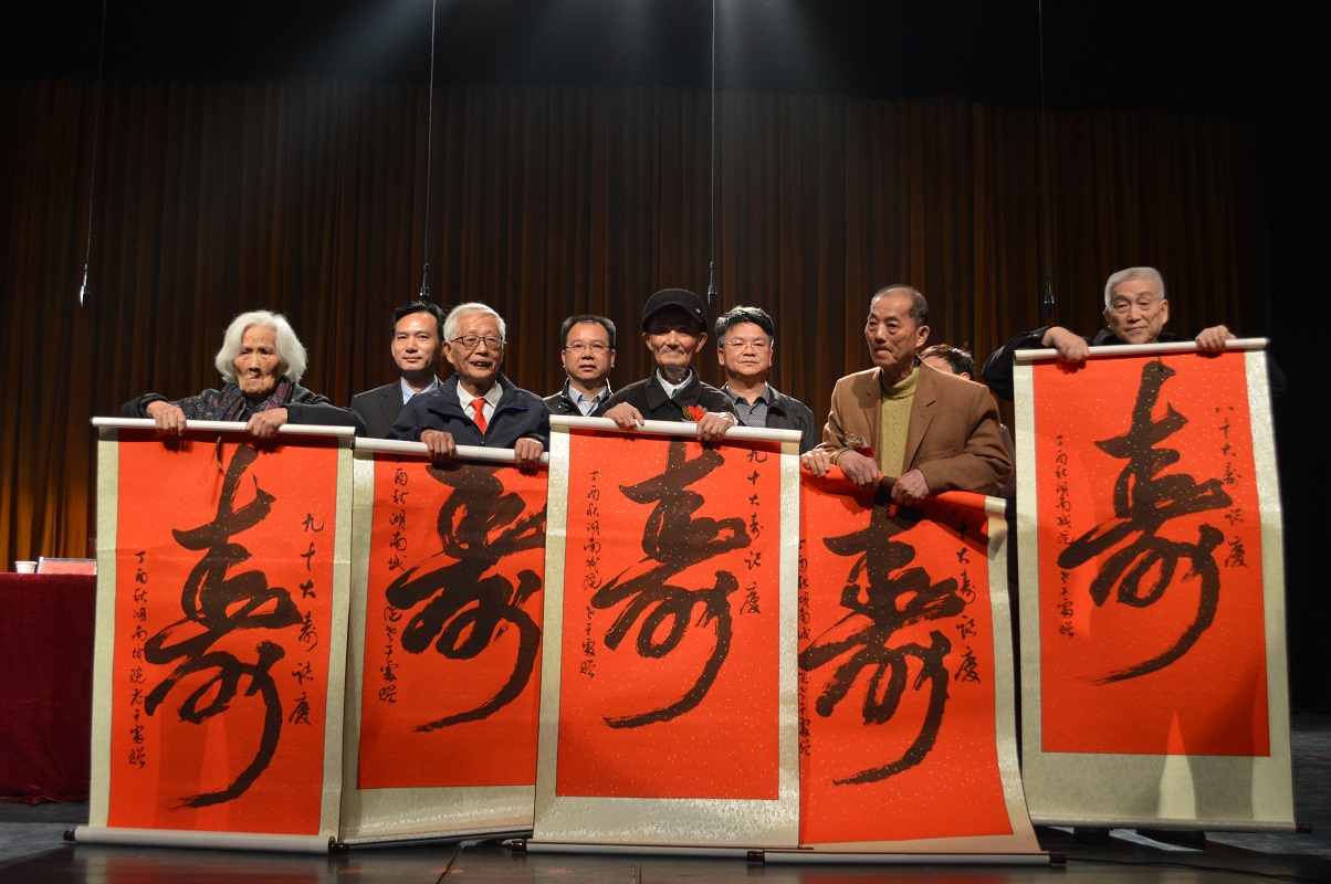 李建奇、汤放华、曹太康为8名寿星、12对金婚钻石婚夫妇授礼。