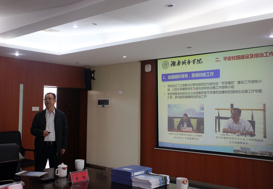 现场考查结束后,考评组在办公楼一会议室听取了学校关于2017年度“平安高校”建设及综合治理工作情况汇报,并反馈了考评意见。校领导罗成翼、李建奇、夏宏宇、谭献良,市公安局党组成员、副局长张凤阳,市公安局国保支队政委皮跃先,朝阳派出所所长彭建新以及相关职能处室负责人出席会议。