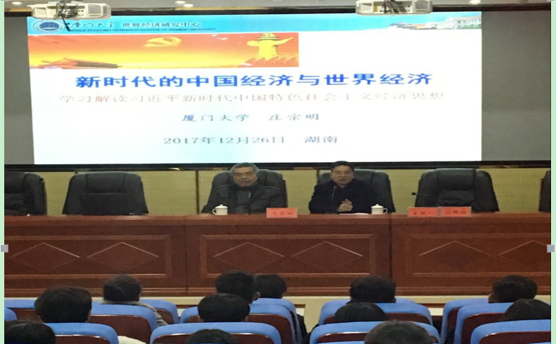 (本网讯)2017年12月26日,厦门大学经济学教授、博导,国务院学位委员会委员、学科评议组成员庄宗明教授应邀来校为beat365官网管理学院师生,作了一堂题为“新时代的中国经济与世界经济”的学术报告,并与管理学院教师举行了座谈。党委书记罗成翼,副校长刘辉煌、何振参加了座谈会。