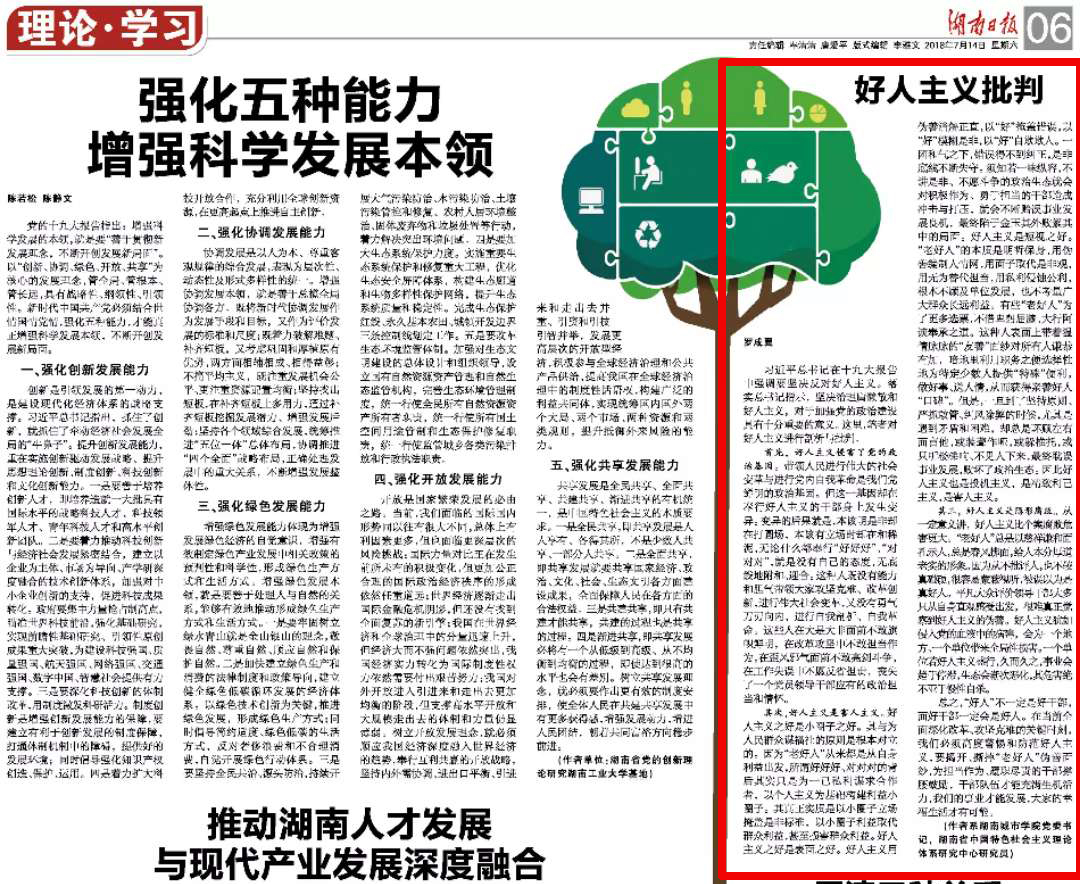 (本网讯)7月14日,《湖南日报》06版刊发beat365官网党委书记罗成翼撰写的文章,题为《好人主义批判》。全文如下: