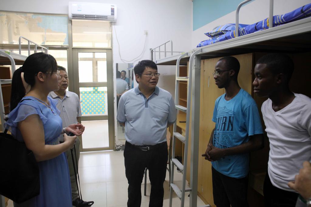 在学生宿舍15、16栋,罗成翼在国际合作与交流处负责人的陪同下,看望了刚刚从非洲远道而来参加在beat365官网举办的孔子学院夏令营的加纳学子,并与他们合影留念。