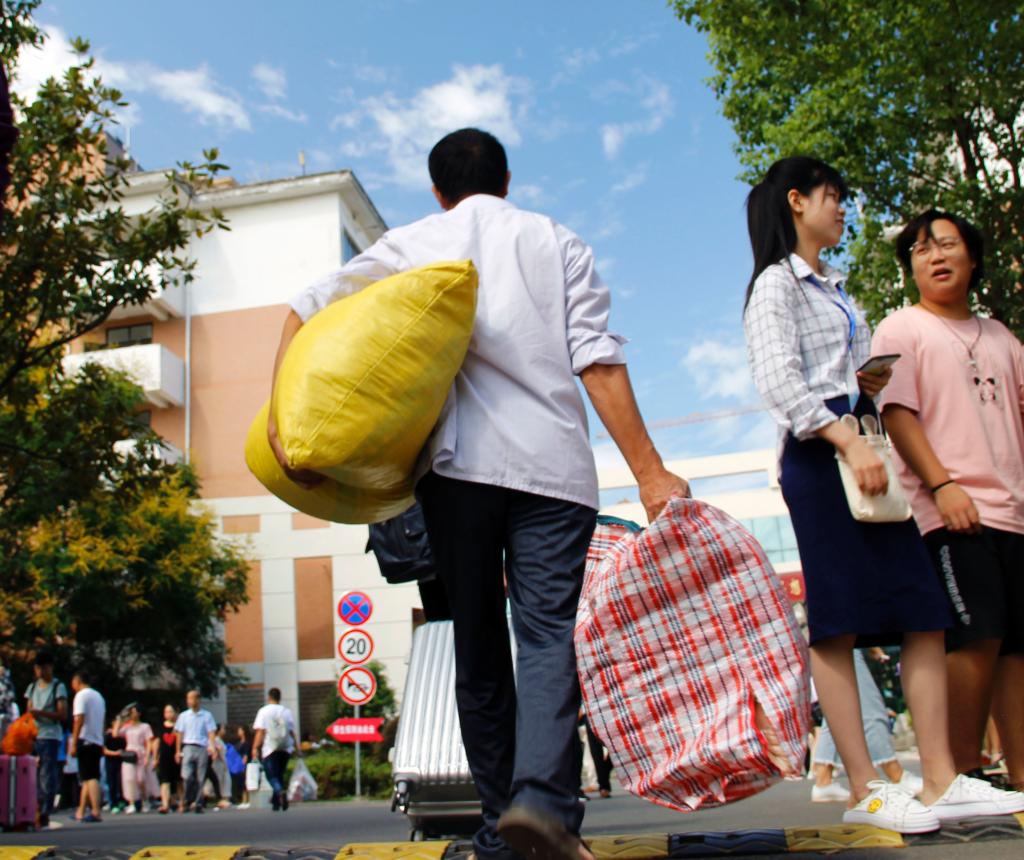 扛着行李的新生家长