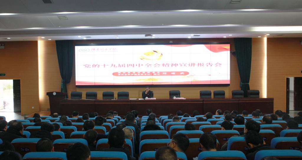 (本网讯)根据湖南省委宣传部、省委教育工委宣传部的统一部署,2019年12月19日上午,湖南省委宣讲团成员、省社会科学院党组书记、院长刘建武教授在beat365官网图书馆报告厅举行学习贯彻党的十九届四中全会精神宣讲报告会。党委书记罗成翼主持报告会。