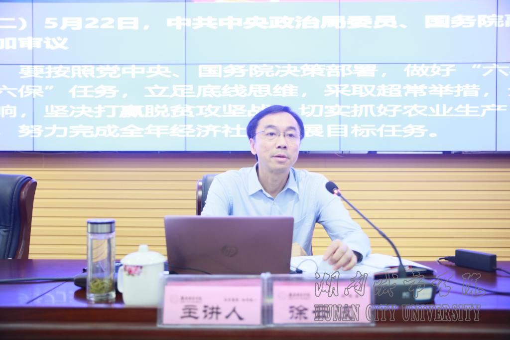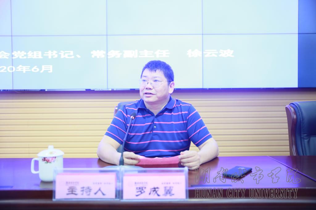 (本网讯)64日,全国“两会”精神宣讲报告会暨党委理论学习中心组(扩大)2020年第四次集体学习在学校图书馆报告厅举行。宣讲会由第十三届全国人大代表、益阳市人大常委会党组书记、常务副主任徐云波主讲,学校党委书记罗成翼主持。