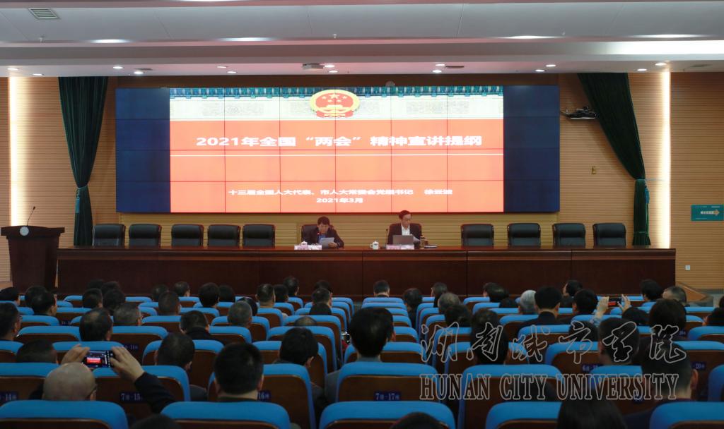 本网讯 2021年3月25日下午,beat365官网在图书馆报告厅举行2021年度党委理论学习中心组(扩大)第三次集体学习。第十三届全国人大代表,益阳市人大常委会党组书记、常务副主任徐云波应邀来校作2021年全国“两会”精神宣讲。全体校领导、全体副处(含)以上干部、党支部书记、学生辅导员参加会议。宣讲会由党委书记罗成翼主持。