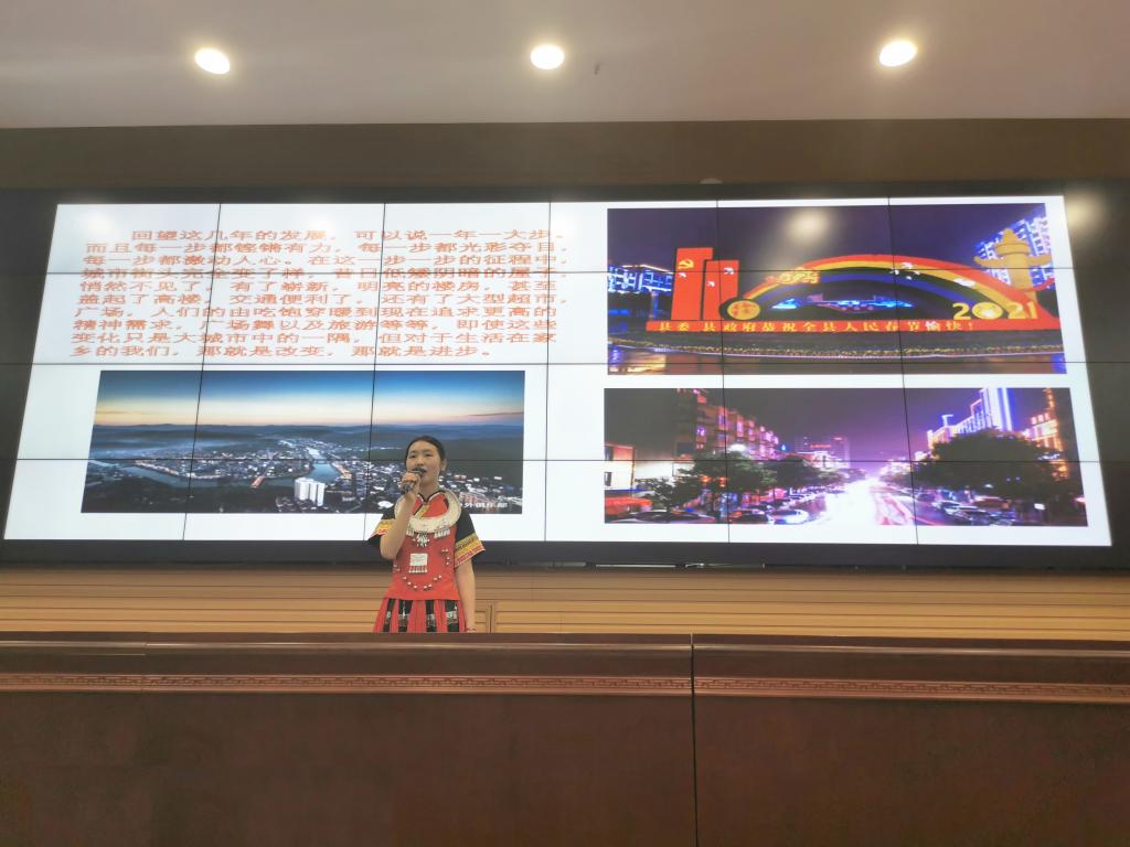 人文学院杨顺以党徽上的金色镰刀和铁锤为切入点,表达了100年来中国共产党对人民的守候。教师教育学院的王悦从教育角度演讲《这一路有微光和星火》,传达了教育兴国、科学兴邦的重要性,指出在扶贫的路上需教育先行。来自土木工程学院的瞿红玉结合自身经历讲述了湘西在中国共产党领导下的蜕变,湘西各族人民团结一心,奋斗不息,在全面建设小康社会的道路上不断奋进。