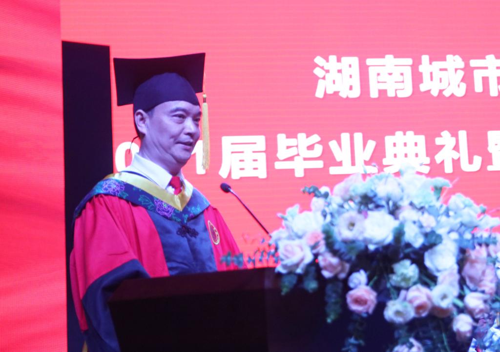 毕业典礼在庄严的国歌声中拉开帷幕。校长汤放华以《生逢盛世 肩负重任》为主题发表了热情洋溢的讲话。他代表学校向圆满完成学业即将奔赴新的工作岗位或继续求学深造的4400余名同学表示衷心的祝贺!向辛勤抚育同学们成长的父母和悉心教育同学们成才的老师致以最崇高的敬意!他指出,一代青年有一代青年的历史际遇,一代青年有一代青年的使命担当。站在“两个一百年”奋斗目标的历史交汇点上,身处科技革命和产业革命持续交融的新时代,面临机遇和挑战交织并存的新世界,同学们要秉承“品学兼修、知行统一”的校训精神,“心系人民、胸怀世界”,保持乘风破浪的昂扬姿态,承担起时代赋予的历史重任,方能不负这中华盛世。他希望毕业生们都能拥有“修齐治平、经国纬政”的才能,胸怀“经世济民、福泽万邦”的情怀,践行“天下兴亡、匹夫有责”的使命,把个人梦融入国家梦、民族梦之中,将回报家国、服务社会作为立德之源、立功之本,走好新时代赶考路,当好新时代答卷人。