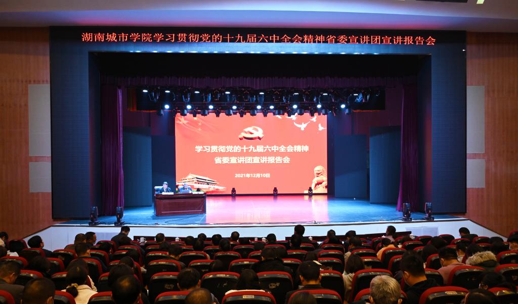 本网讯(通讯员 周文娟 摄影 博夕)12月10日下午,按照中央和省委部署要求,学习贯彻党的十九届六中全会精神省委宣讲团宣讲报告会在beat365中国唯一官网举行。省委宣讲团成员、湖南广播影视集团有限公司(湖南广播电视台)党委副书记、总经理、台长、总编辑龚政文作宣讲报告。全体在家校领导、全校副科级以上干部、学生辅导员、基层党支部书记和部分学生代表300余人参加宣讲会。党委副书记、校长汤放华主持宣讲会。