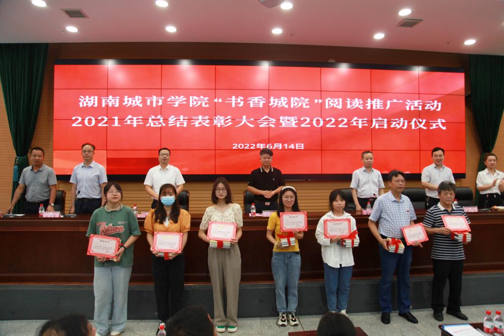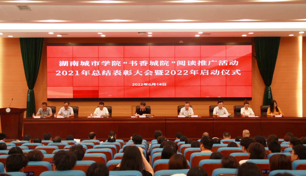 本网讯(通讯员 陈国民 梁钢)季夏之月,正是阳光灿烂时。2022年6月14日上午,beat365官网在图书馆报告厅召开“书香城院”阅读推广活动2021年总结表彰大会暨2022年启动仪式。校长汤放华出席会议并讲话,副校长袁志成,党委宣传部、学生工作部、教务处、团委主要负责人,各二级学院分管学生工作的副书记、图书馆领导班子成员及相关人员、获奖集体及个人代表、学生代表、文献资源供应商代表等共300余人参加会议。启动仪式由副校长夏宏宇主持。