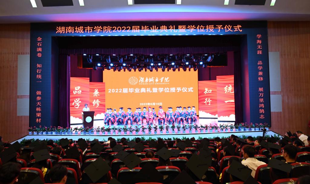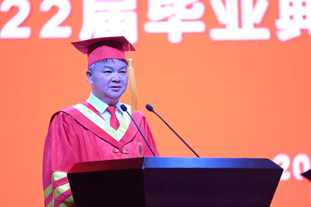 在热烈的掌声中,校长汤放华向2022届毕业生致辞。他代表学校向学有所成、顺利毕业的2022届毕业生致以热烈的祝贺!向辛勤培育他们的父母和老师们致以最崇高的敬意!