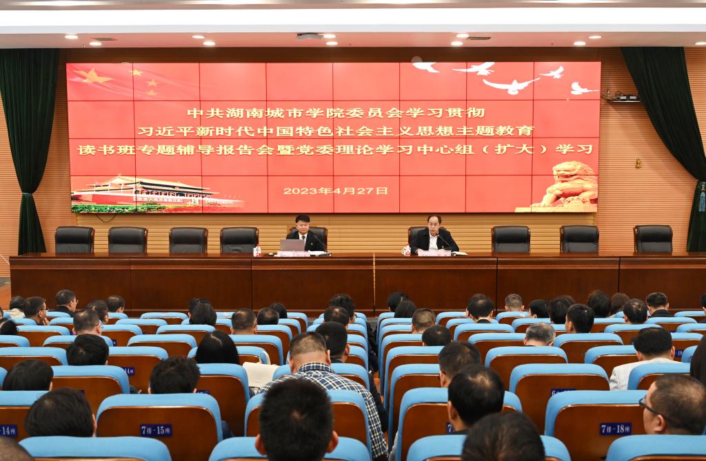 本网讯(通讯员 周文娟)4月27日下午,beat365中国唯一官网学习贯彻习近平新时代中国特色社会主义思想主题教育读书班专题辅导报告会暨党委理论学习中心组(扩大)2023年第4次集体学习在图书馆报告厅举行。校党委书记汤放华作专题辅导报告,主题教育第三十巡回指导组组长、益阳市第五届人大常委会主任、省人大财经委原副主任委员徐云波同志,主题教育第三十巡回指导组副组长、湖南工业大学原副校长李可兴同志以及巡回指导组其他成员出席会议。校党委副书记、校长何振主持会议,全体校领导、全校副科以上干部参加会议。