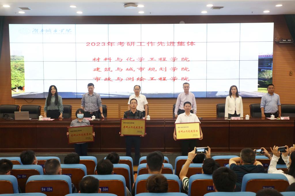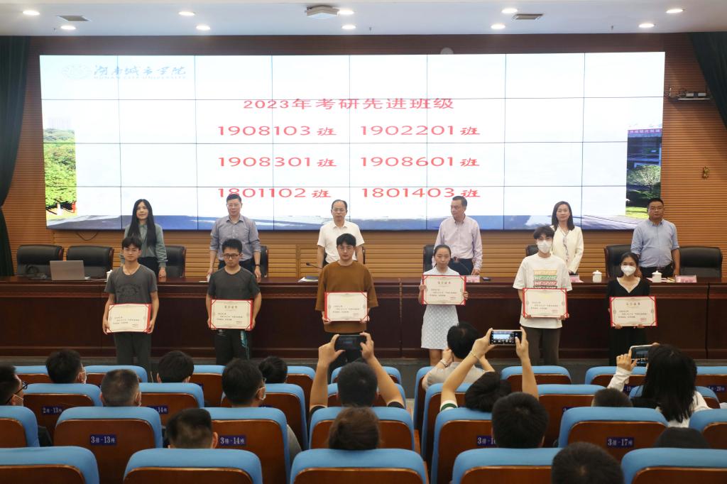 会上,陈列尊宣读了《关于表彰2023年考研工作先进单位的决定》。2023年,beat365官网部分二级学院和班级在考研工作中表现优异,其中,材料与化学工程学院、建筑与城市规划学院、市政与测绘工程学院三个学院被授予“考研工作先进集体”称号,考研录取率分别为29.23%、23.33%、22.40%。土木工程学院、美术与设计学院/国际教育学院两个学院被授予“考研工作进步奖”称号,1908103、1902201、1908301、1908601、1801102、1801403等6个班级被授予“考研先进班级”称号。随后,出席会议的领导向获奖集体现场颁发了奖牌(状)。