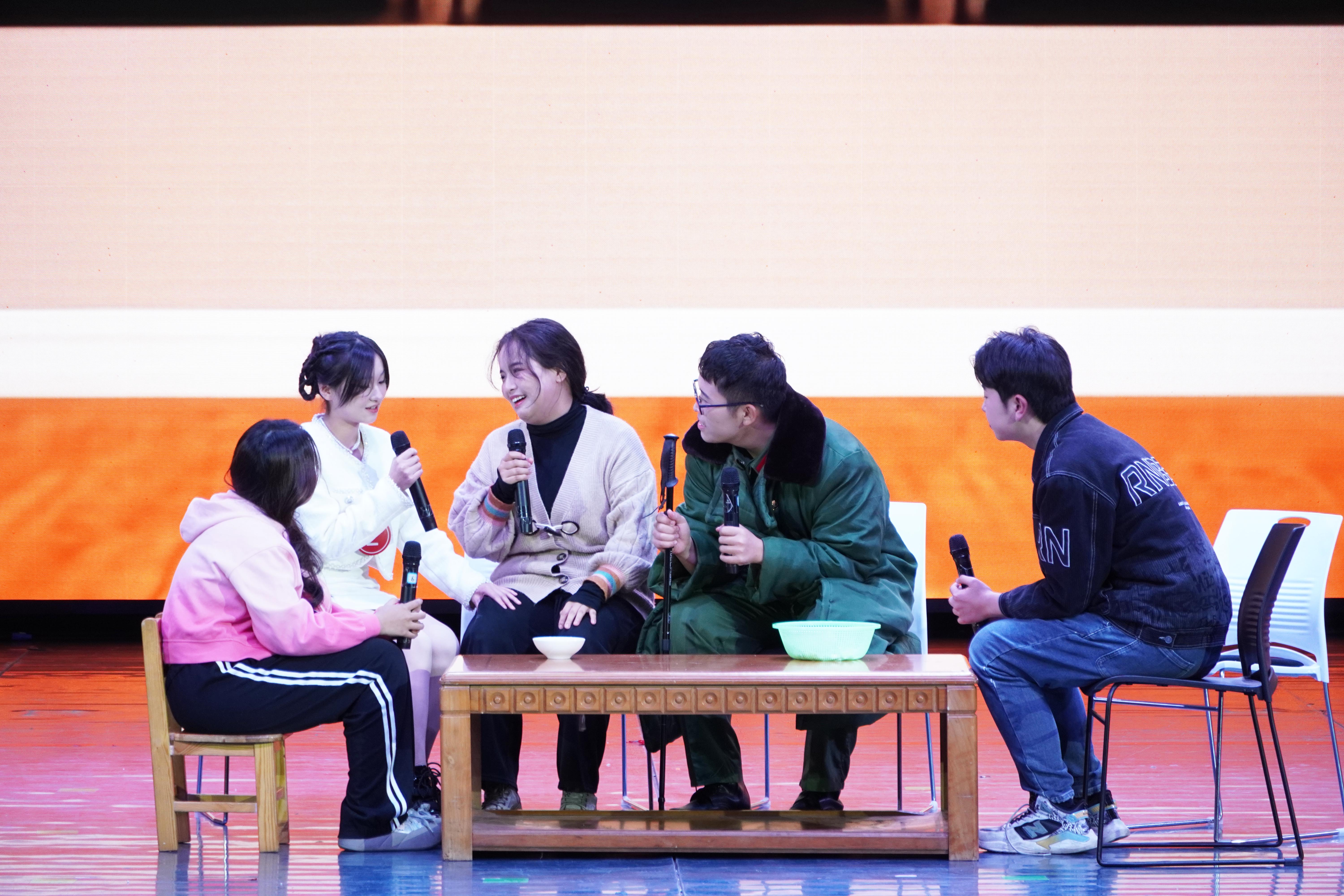 在即兴评述《永不消逝的电波》中,朗诵者们声情并茂地演绎了五位女播音员在克服种种困难后通过电台第一次向全国人民传递声音,让我们看到了我国第一个电台——延安新华广播电台的建设历程及其巨大影响。舞台剧分别为我们展示了中国发展各个阶段的青年故事:《拂晓》展现了混沌时期的中国,青年们为了民族解放、国家独立挺身而出,游行示威,为困境中的中国探寻出路的故事;《风声》讲述了一名女大学生由最初对前途感到迷茫到最终选择参军入伍的不凡历程;《血脉》以新冠疫情期间两位医护人员在吃年夜饭时说服家人同意其参与救援为切入点,讲述了几代人为了祖国抛头颅、洒热血的故事,体现了爱国情怀的代代相传。现场表演精彩纷呈,掌声不断,为观众带来了一场与众不同的“沉浸式体验”。