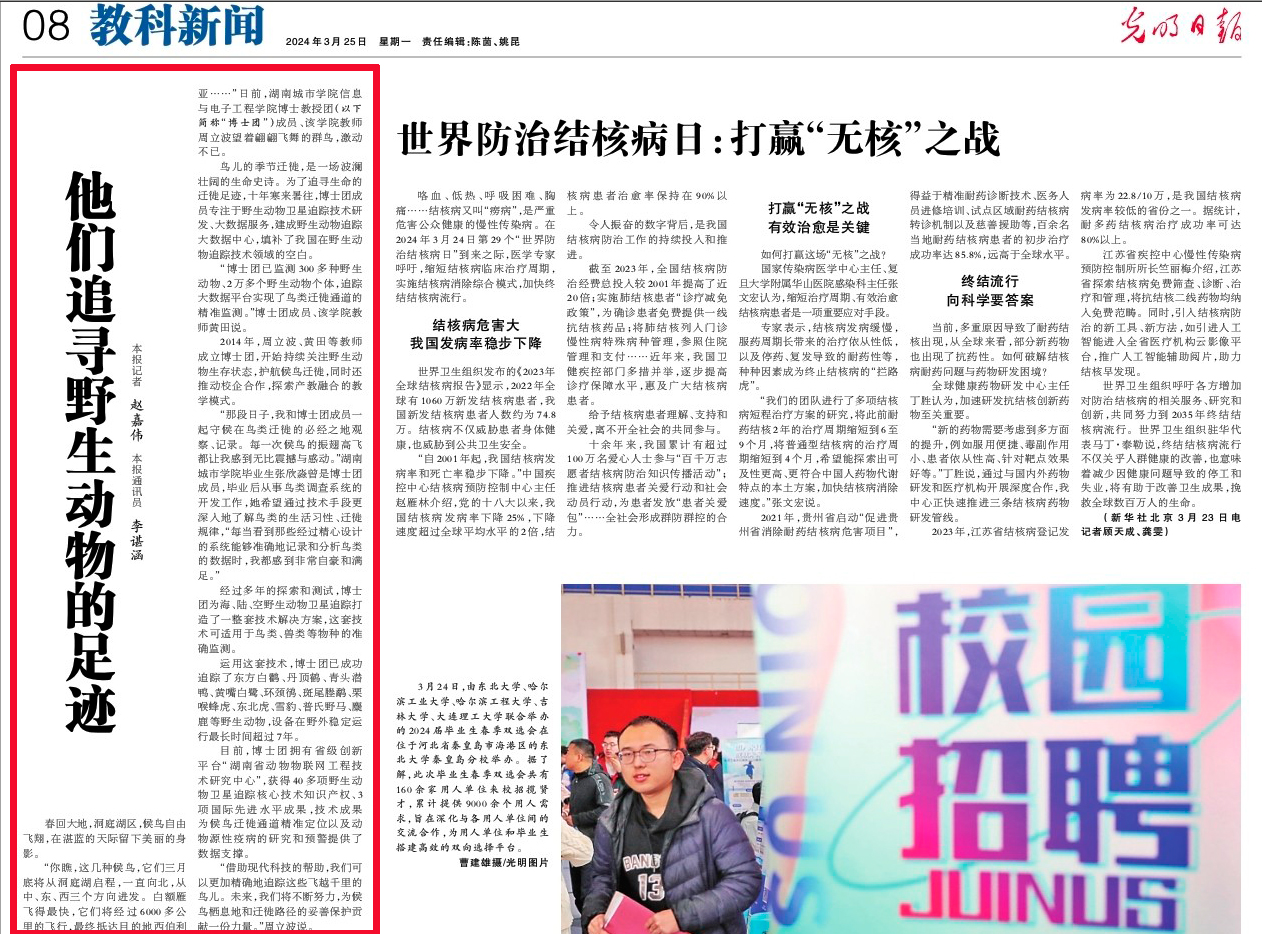 《光明日报》3月25日第8版报道beat365中国唯一官网博士团聚焦野生动物卫星追踪技术研发。