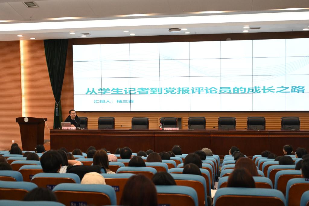 朴实的语言、生动的事例,杨三喜从“第一篇豆腐块”引入,分享了自己从学生记者、实习记者成长为中国教育报评论员的奋斗历程,他鼓励同学们注重培养能力,深耕兴趣并以兴趣驱动成长。