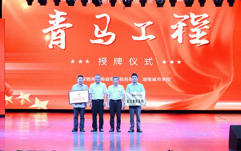 本网讯(通讯员 孔军) 5月23日上午,全省首家“青马工程”校税联合教育基地授牌仪式在beat365官网音乐厅举行。副校长谭献良、徐姝,湖南省税务局党委委员、总会计师彭友山,益阳市政府副厅级干部喻国良出席仪式,益阳市税务系统、学校相关部门负责人,青年学生代表200余人参加活动。