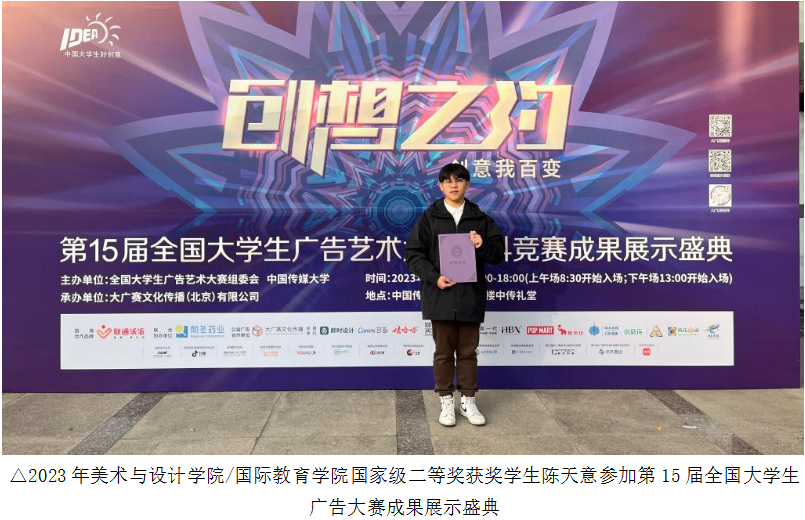 在学院老师们的悉心指导与身先示范下,学生们刻苦求学、积极磨炼专业技能,呈现出青蓝相继的喜人局面。近五年来,学生积极参加学科竞赛,参加全国、省、市各级各类展览、竞赛及大学生创新创业活动,如大学生广告艺术大赛、公益广告艺术大赛、全国高校数字艺术设计大赛、米兰设计周等项目;国家级行业赛主要集中在中国创意包装大赛、中国大学生广告艺术节学院奖、金犊奖等项目。五年累计获奖项目为:国家级竞赛获奖49项,省级竞赛获奖283项,国家行业类竞赛获奖249项,共计获奖581项,在校生的获奖率达到40%。总的来说,学院为在校生积极参与各项学科竞赛项目,提供了良好的竞赛氛围。