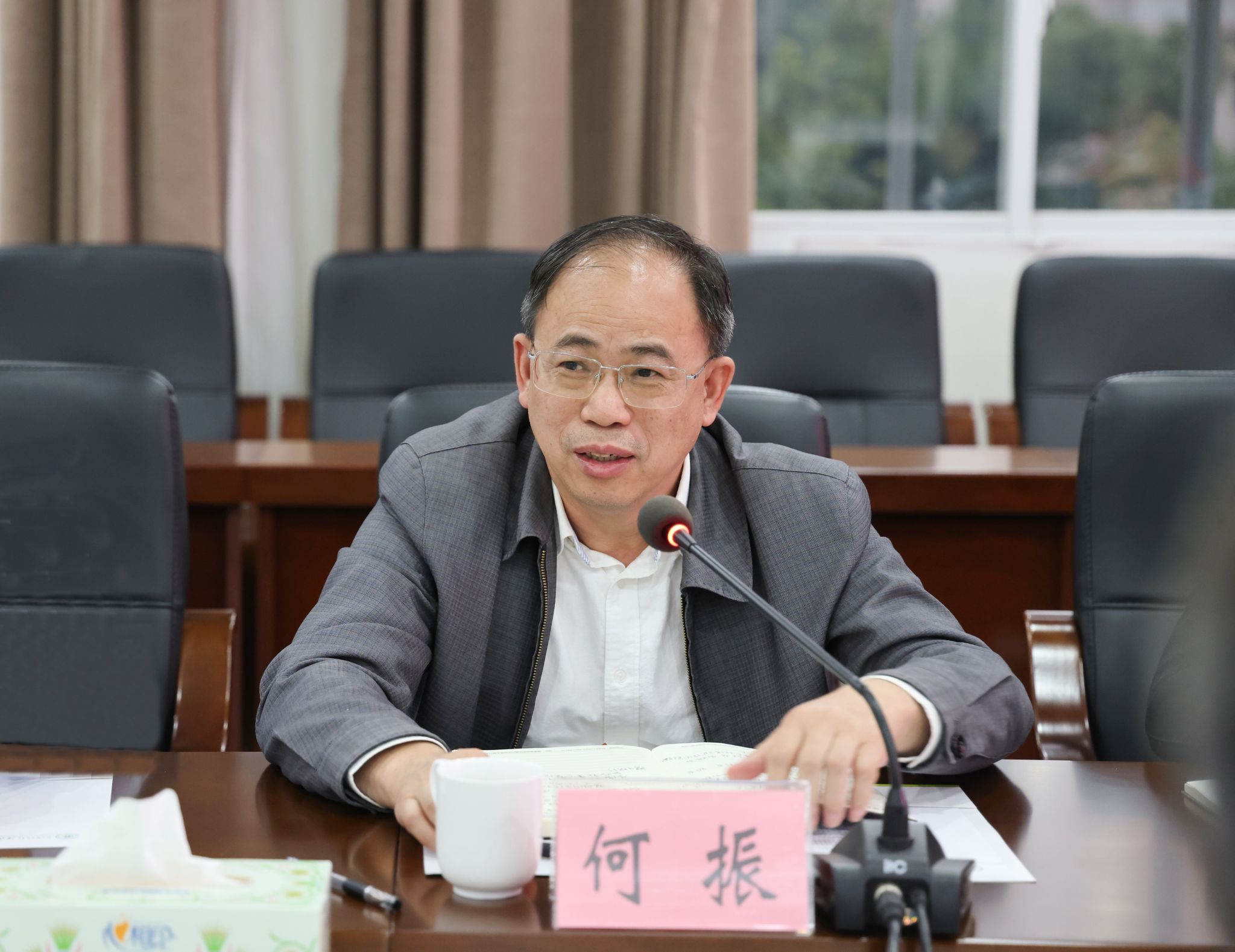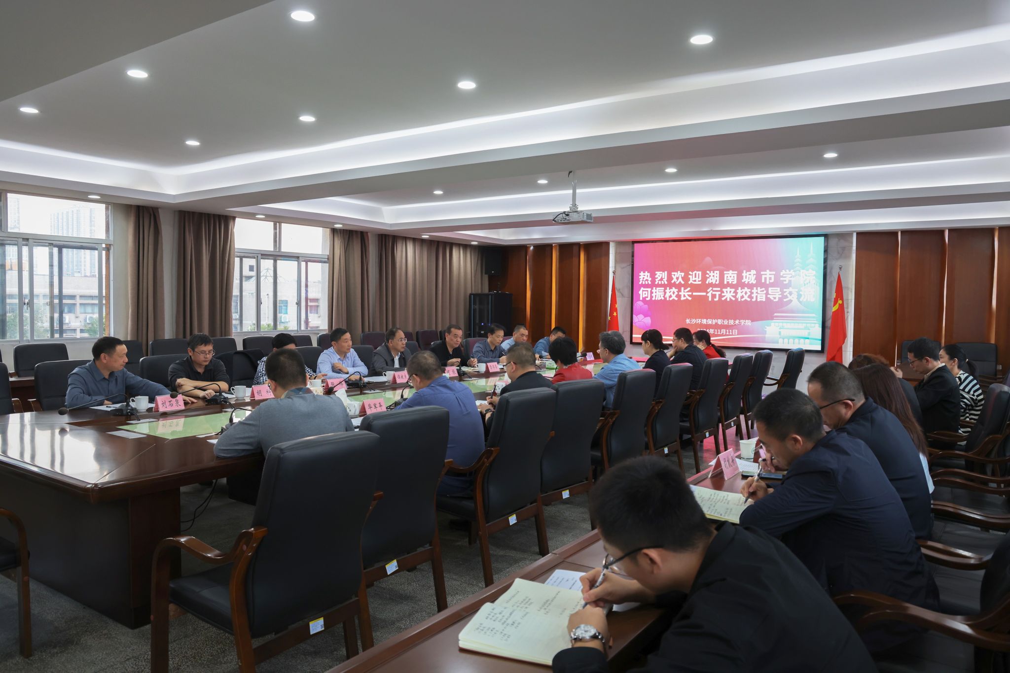 双方就“楚怡工匠计划”等工作展开座谈交流。座谈会上,长沙环境保护职业技术学院校长黄凤莲代表全校师生向何振一行表示热烈欢迎并介绍学校基本情况。随后,与会人员围绕教育教学、科学研究、基本建设等方面展开交流。