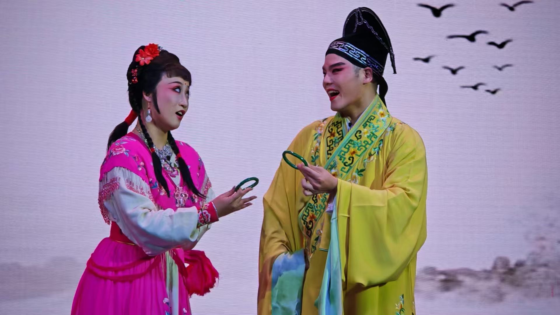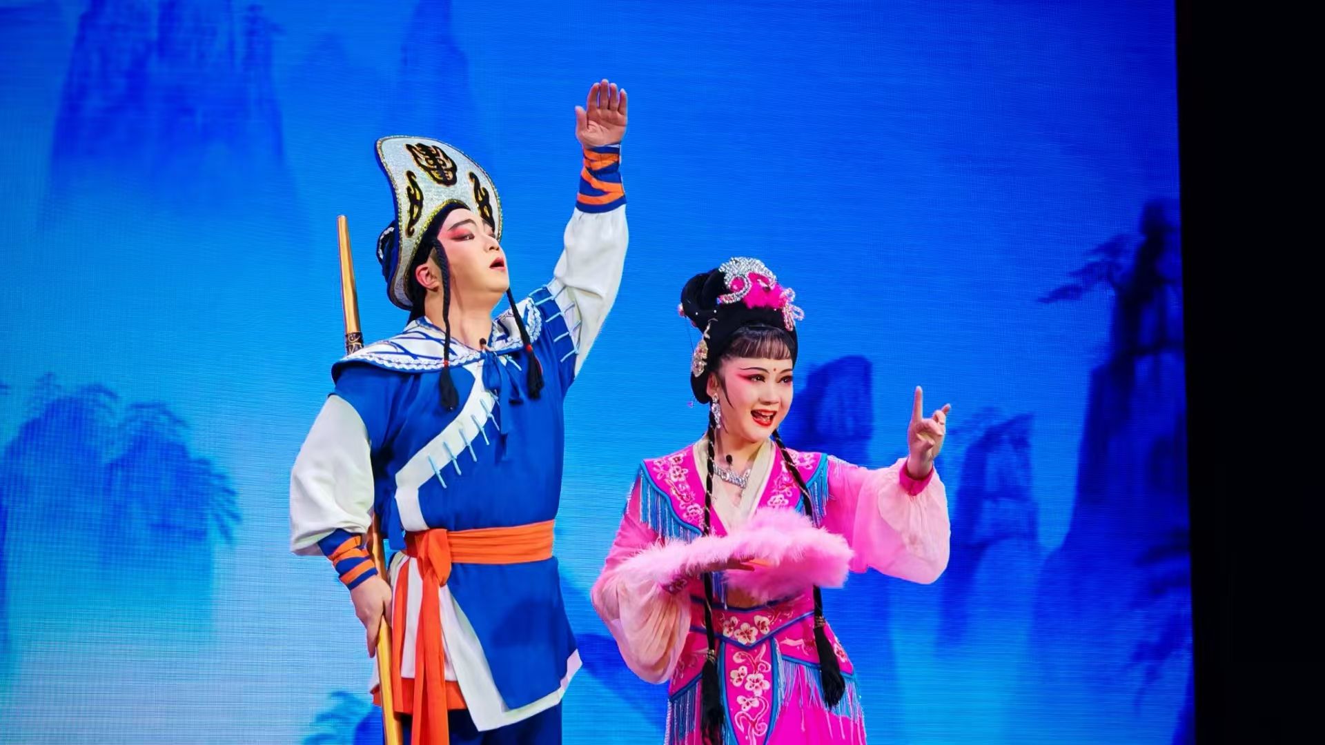 由优秀青年演员刘涛和李枝阳带来的《送表妹》。德姑娘活泼俏皮,田伢子直率木讷,二人载歌载舞妙趣横生。德姑娘的主动示好与田伢子的懵懂憨态,他们生动鲜活的人物塑造,引得台下阵阵欢笑与喝彩。