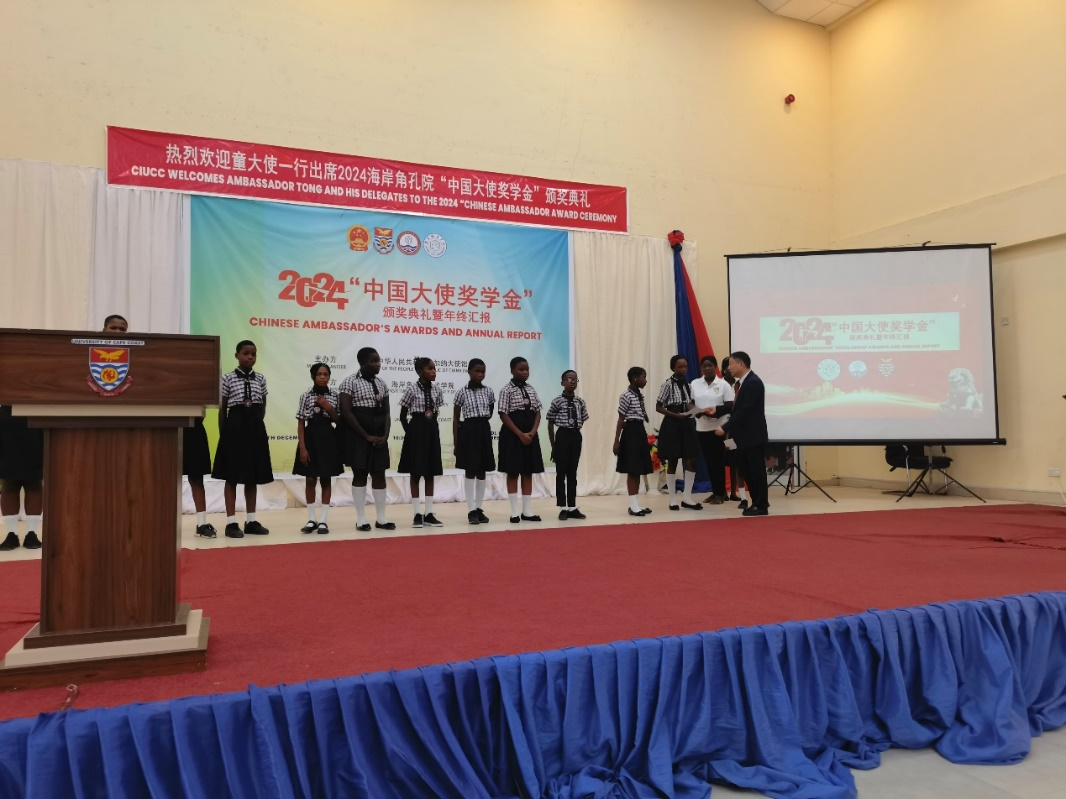 童德发肯定了孔子学院在推动当地中文教育和中华文化传播方面发挥的积极作用。他指出,使馆将继续为国际中文教育推广和中华文化交流提供支持,为两国教育文化交流合作注入新的活力,促进中加友谊枝繁叶茂、代代相传。同时,童德发为孔子学院“中国大使奖学金”获得者颁发荣誉证书及奖金。