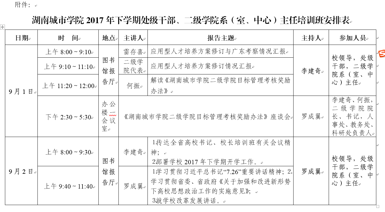 具体培训安排见《beat365中国唯一官网2017年下学期处级干部、二级学院系(室、中心)主任培训班安排表》。