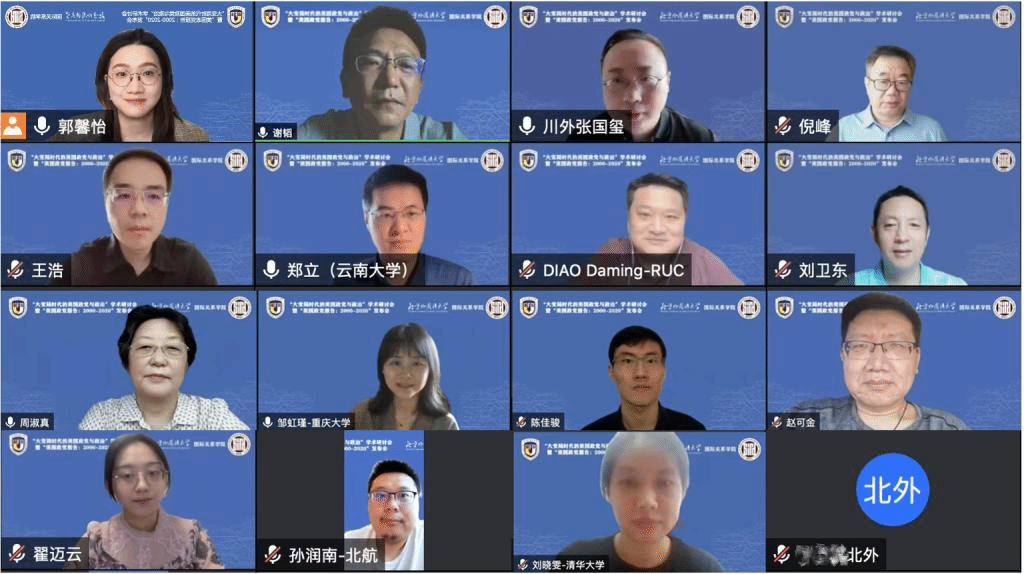 2022年7月25日,由必赢76net线路官网主办的“大变局时代的美国政党与政治”学术研讨会暨“美国政党报告:2000-2020”发布会在线上召开。来自北京外国语大学、中国人民大学、清华大学、复旦大学、北京航空航天大学、云南大学、四川外国语大学、重庆大学、中共中央党校、中国社会科学院、上海市美国问题研究所等高校和研究机构的15位专家参加研讨会。