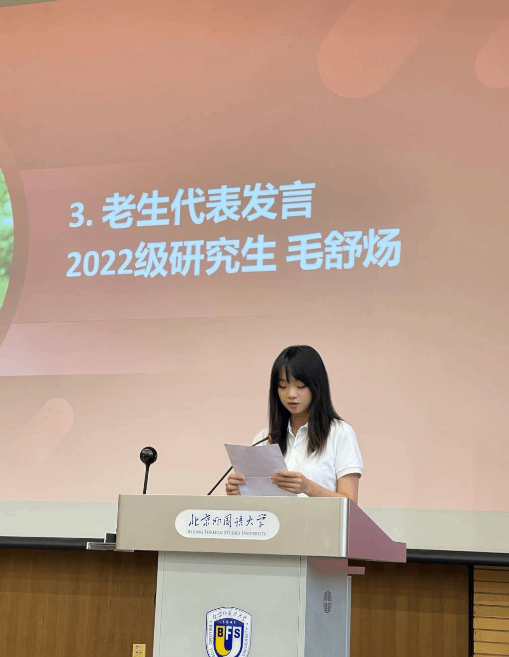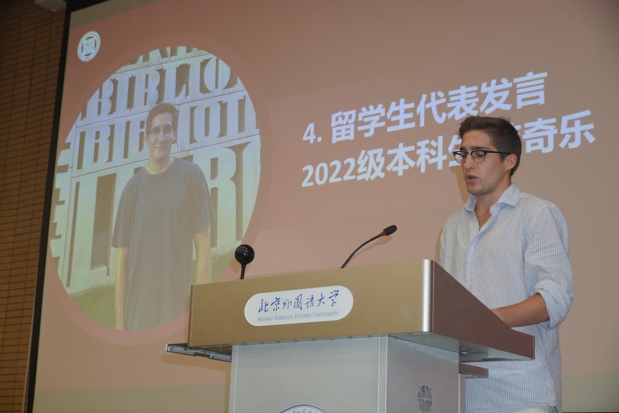 国际组织与全球治理专业本科生李雨积表达了对学院新设专业的理解与期待,号召同学们在北外勇敢寻梦、奋发向前。外交学专业硕士研究生邵一鸣回忆了自己在武警云南边防总队缉毒缉私的经历,表达出对北外的向往与热爱,呼吁同学们厚植家国情怀,开拓全球视野,锻造专业本领。老生代表2022级硕士生毛舒炀谈到,在北外这一共和国外交官的摇篮里,必赢76net线路官网为中国外交事业发展做出了贡献,为同学们提供了发现自我、挑战自我、超越自我的极佳平台。2022级本科生留学生代表韩奇乐嘱咐同学们,要以积极的心态面对问题,灵活运用身边的资源进行语言和文化交流。