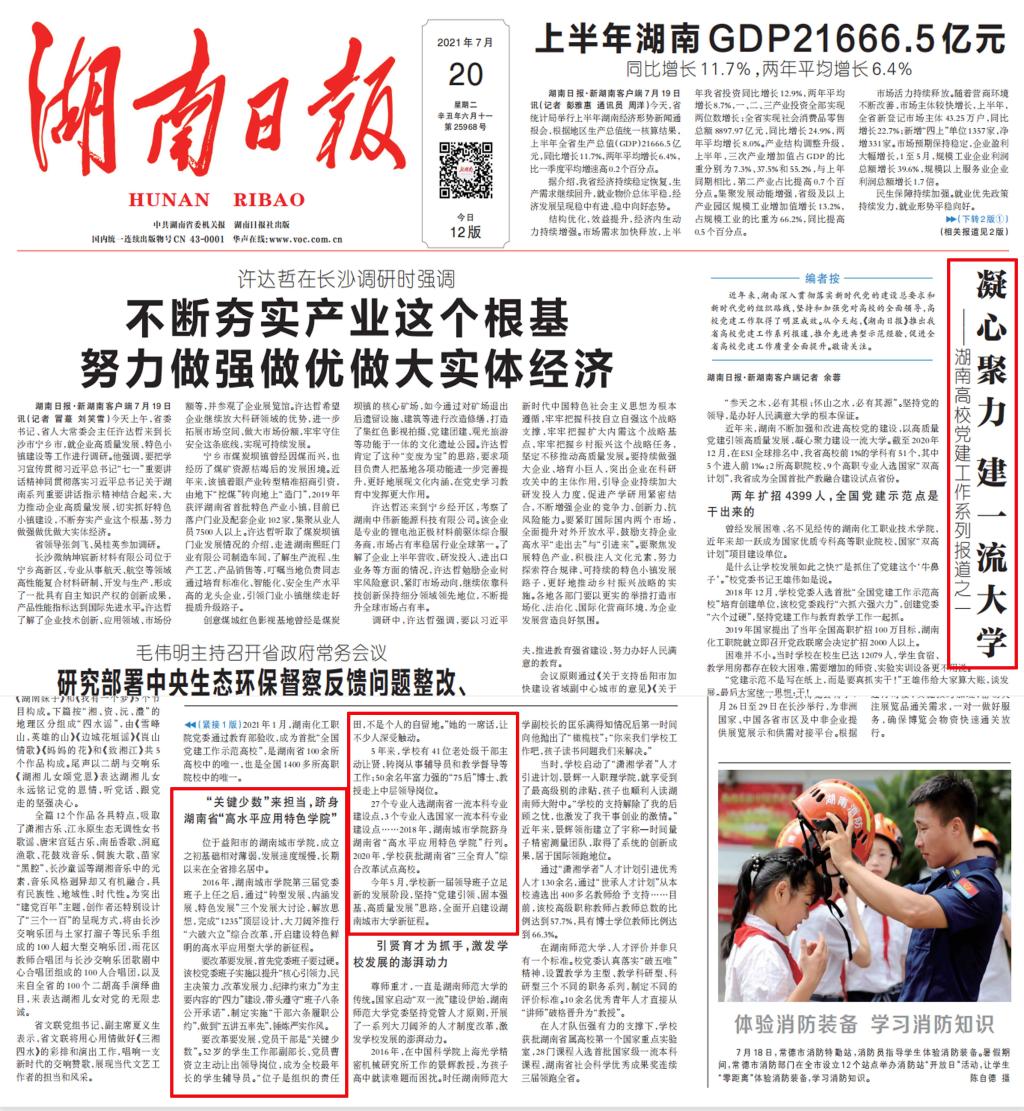 《湖南日报》7月20日头版报道beat365官网以高质量党建引领高质量发展,凝心聚力建设一流大学。