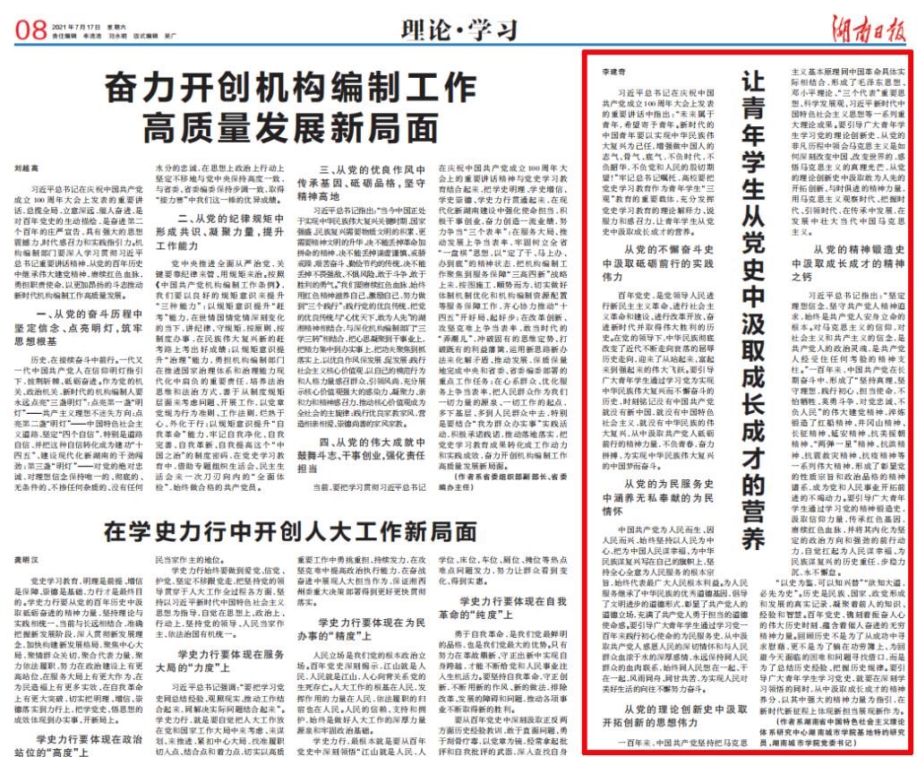 《湖南日报》2021年7月17日08版“理论·学习”版刊登党委书记李建奇的文章。