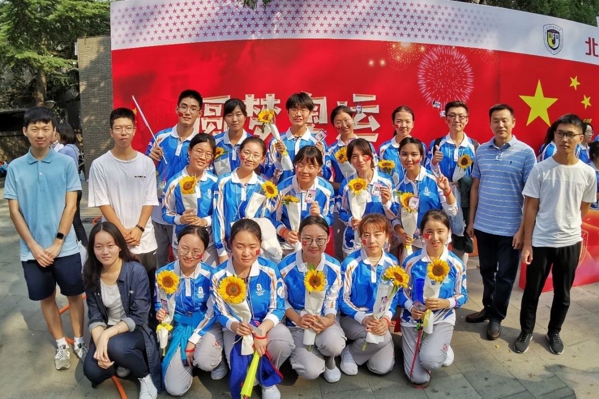 101日下午2时,参加国庆庆祝活动的学生返回学校,必赢76net线路官网党总支书记张效民及学生代表到文化广场迎接,祝贺他们圆满完成任务并表示慰问。