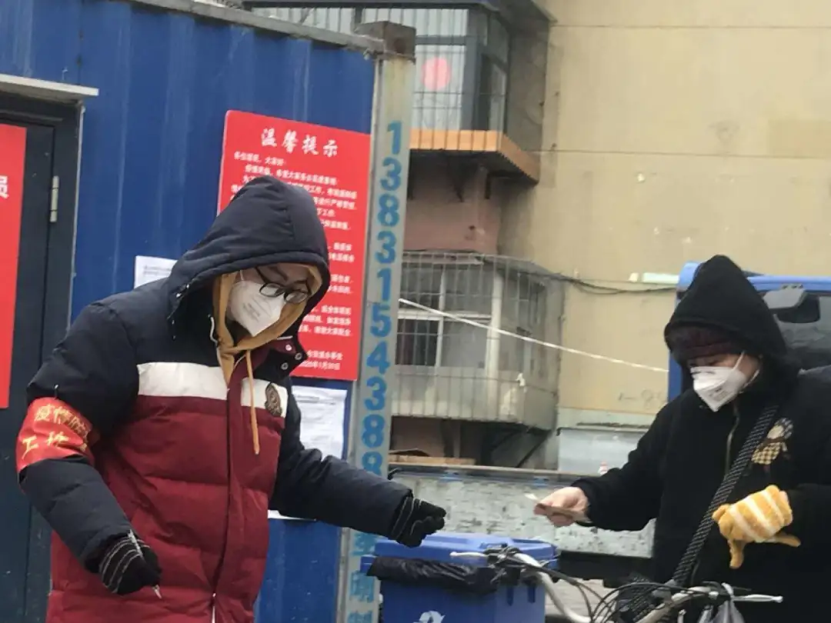 18级王姝懿同学也在社区门口做志愿者。站岗期间,她负责记录出入人员名单,并检查其通行证。其实这项工作并不复杂,但若在东北零下二十多度的温度下进行,却是异常艰辛。在站岗期间,恰逢东北地区降雪,她和其他志愿者轮流站岗,休息期间就到旁边的棚子里取暖,但棚子里的温度也是零下,甚至会有雪花飘进来,四周还透着寒风,穿着长到脚踝的羽绒服和雪地靴依然感到很冷。在外站岗,落在衣物上的大雪融化后,眼镜和衣服也都会被打湿。但是大家谁也没有说累,因为我们有一个共同的信念:一定要打赢疫情防控阻击战。