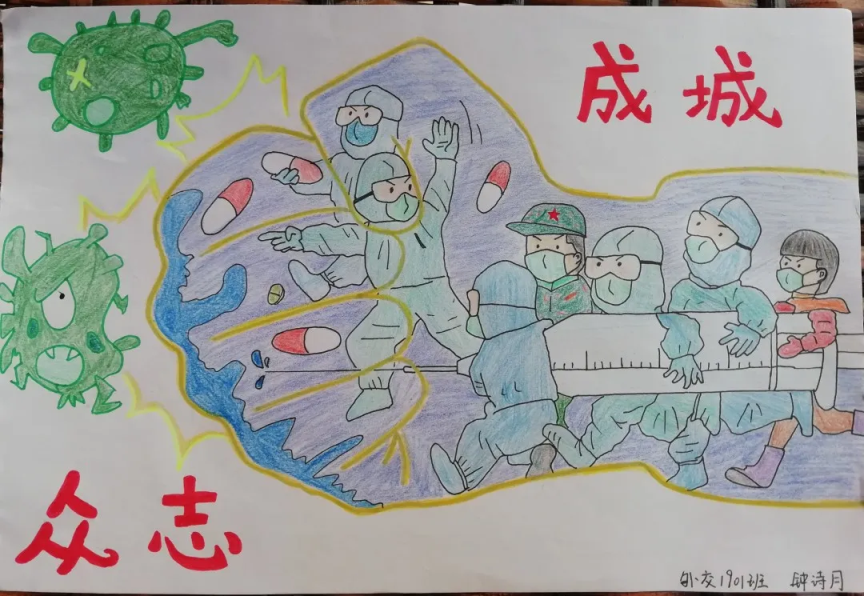 这是来自1901班的钟诗月同学有关“抗击疫情、众志成城”的手抄报。她解释说:“这次抗击新型冠状病毒肺炎疫情是一场没有硝烟的战争。作为北外国关的一员,我用自己的方式表达着对抗击疫情的支持。这幅手绘漫画中,穿着防护服的是战斗在一线的医护人员们,身穿迷彩服的是解放军,衣着打扮像学生一样的是志愿者们。漫画中的人象征着全国人民,他们坚强有力,能够一拳将病毒击垮。这幅漫画代表着全国人民战胜病毒的信心,也代表着像我这样的志愿者对抗击疫情的支持。”
