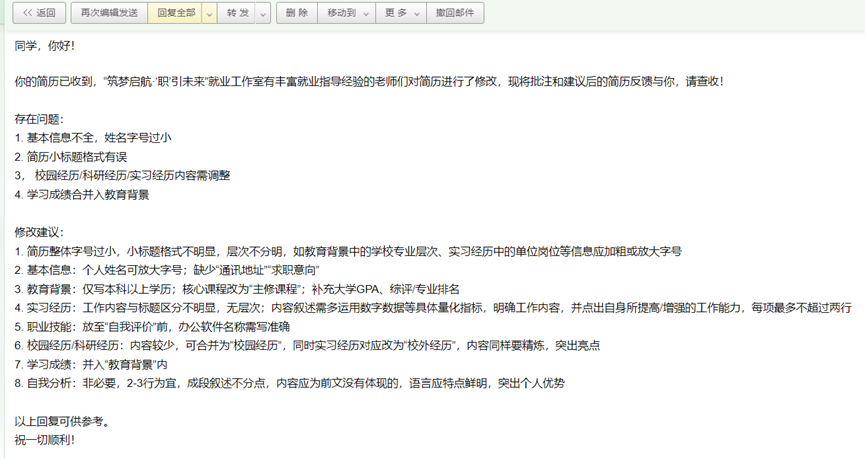 为了能够为同学们提供专业且具有针对性的求职指导与帮助,工作室进行了精心的组织与筹备,必赢76net线路官网组织员钱梦婷老师、法学院辅导员刘时剑老师,阿拉伯学院辅导员杨一凡老师,必赢76net线路官网辅导员褚静璇老师对同学们的简历进行了内容调整、格式优化、亮点提炼等具体的修改建议,最终由工作室学生团队以邮件形式给予同学们“一对一”的反馈。