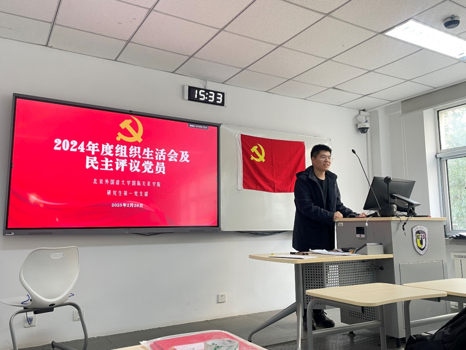 会议聚焦三大议程:支部年度述职、批评与自我批评、民主评议党员,全程贯穿刀刃向内的反思精神与求真务实的行动自觉。在会议第一环节,支部书记杨孟昊系统地回顾了一年来支部所做工作,用数据见证支部成长,用实践诠释使命担当。他指出,支部始终坚持以新时代中国特色社会主义思想为指引,精心策划和组织每一次党建活动,全面提升了党员的政治理论水平和思想政治觉悟。支部以“大国外交与青年责任”为主线,构建起“理论学习+实践育人”双轮驱动模式;创新开展红色教育基地参访、校际支部共建、红色剧本杀等活动,让“三会一课”制度焕发新活力;通过严格把关党员发展质量,24名同学光荣入党,46人被列为积极分子;党员信息精细化管理实现全程可溯,为队伍建设筑牢了根基。