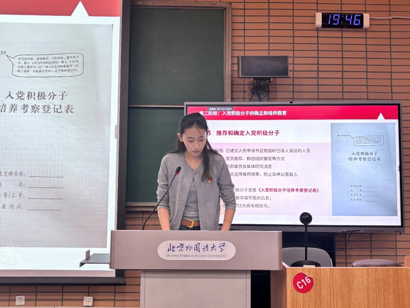 随后,王羽佳围绕“入党积极分子的确定和培训教育”“发展对象的确定和考察”“预备党员的接收”及“预备党员的教育、考察和转正”四个方面进行详细讲解,同时针对以往学生对入党流程不熟悉、入党申请书书写错误等问题进行了详细指导,并指出入党的庄重性和严肃性。她鼓励新生积极学习党章内容,在实践中积极向党组织靠拢,用初心砥砺信仰,用理论坚定信念。